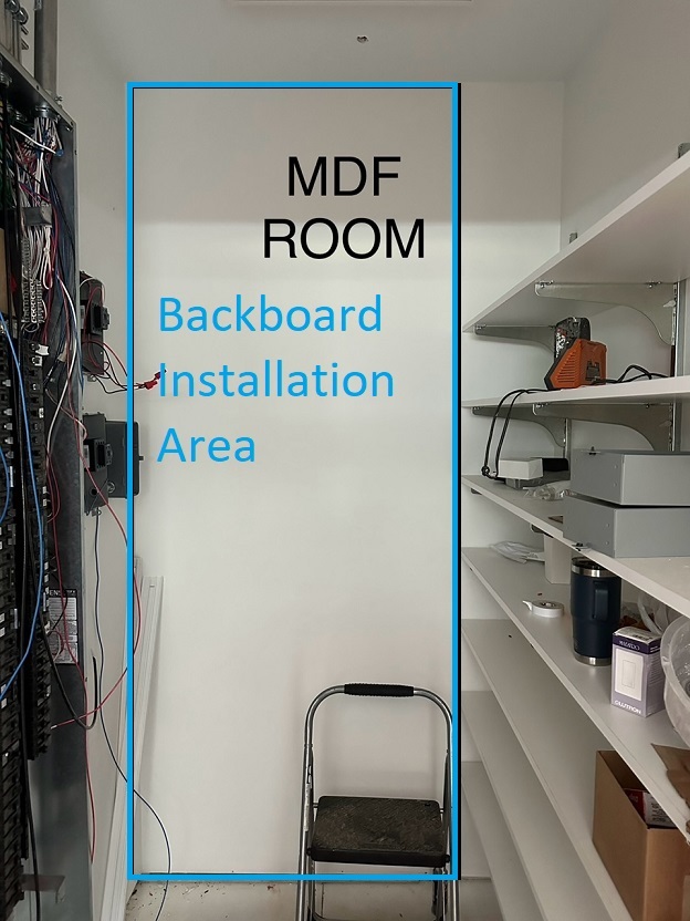 IT network MDF & cat6 cabling installation showing backboard's fireproofed stamp