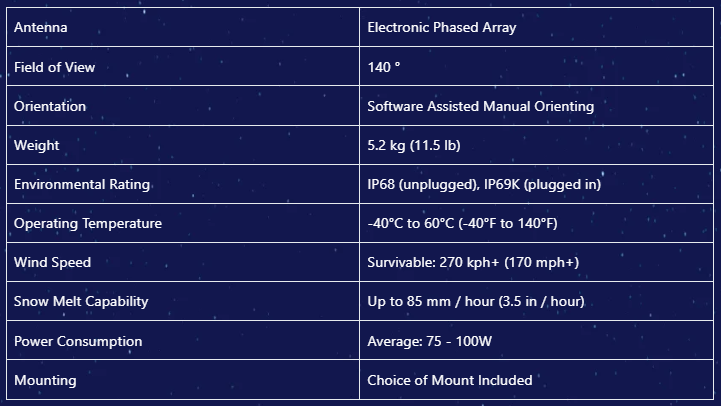 The new Starlink Performance Gen3 model is built to withstand tough environments. With an IP rating of IP68 (unplugged), IP69K (plugged in) for dust and water resistance, and an operating temperature range from -40°F to 140°F—making it a reliable choice for rugged construction and development sites.